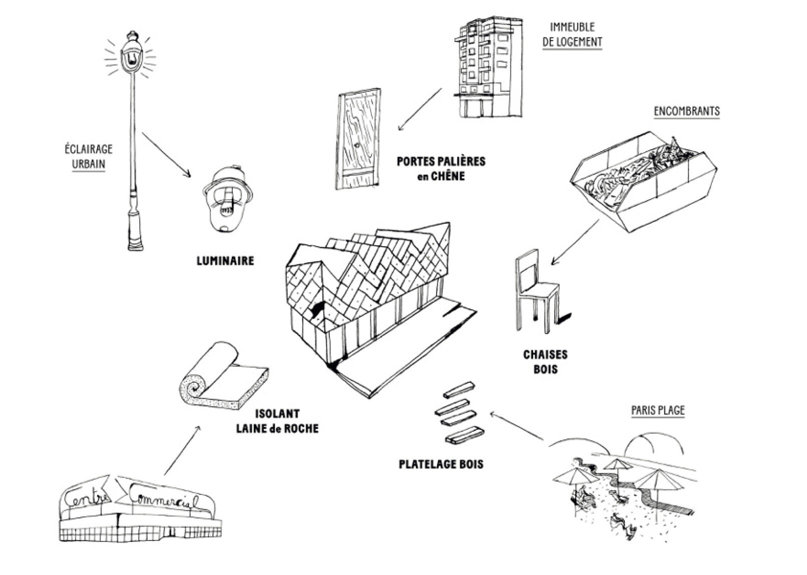 La façade est composée de 180 portes en bois, issues de la réhabilitation d’un immeuble de logements. L’isolation intérieure en laine de roche provient de la dépose de la toiture d’un supermarché. La structure bois est constituée des restes d’un chantier de maison de retraite. Sols et murs sont réalisés à partir d’anciens panneaux d’exposition, tandis que le caillebotis de la terrasse extérieure est issu de l’opération Paris-Plage.