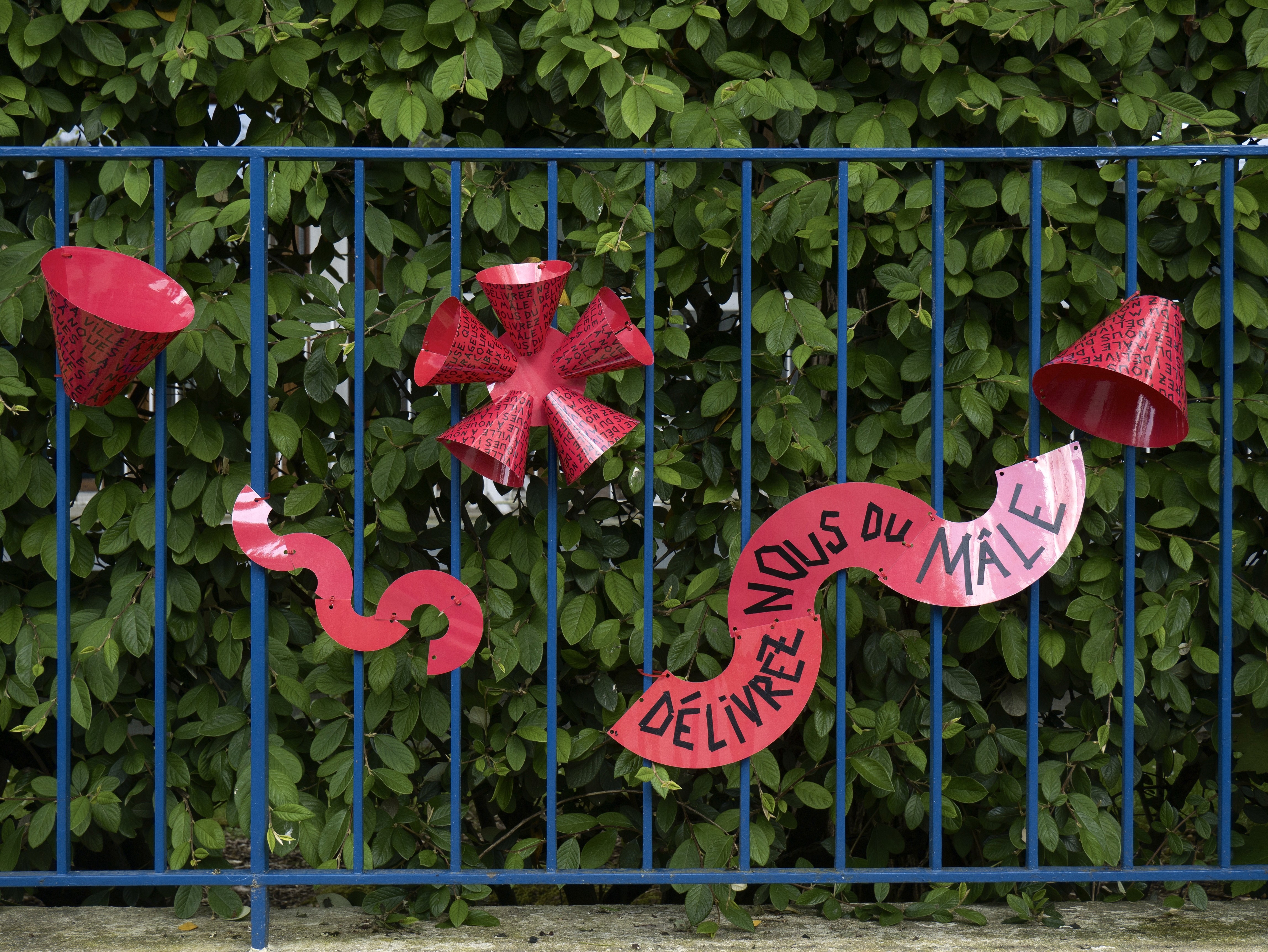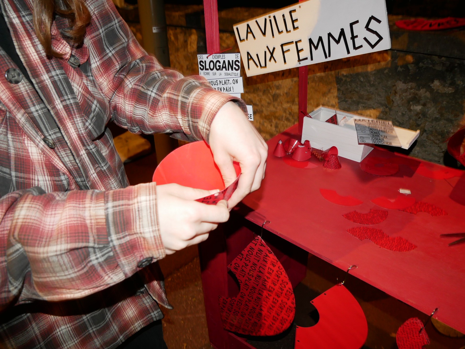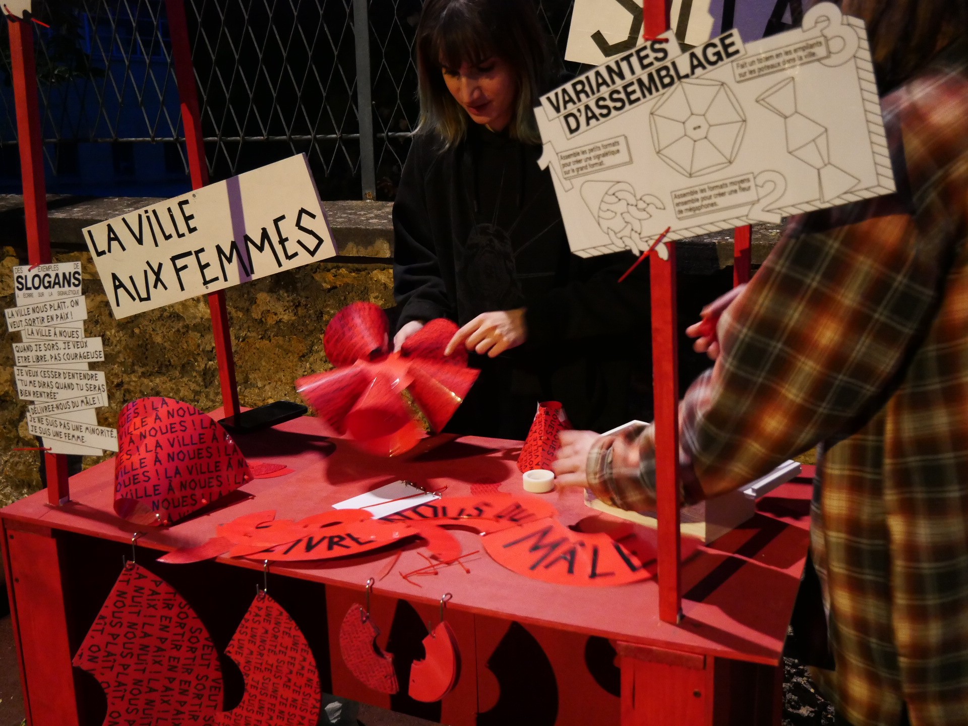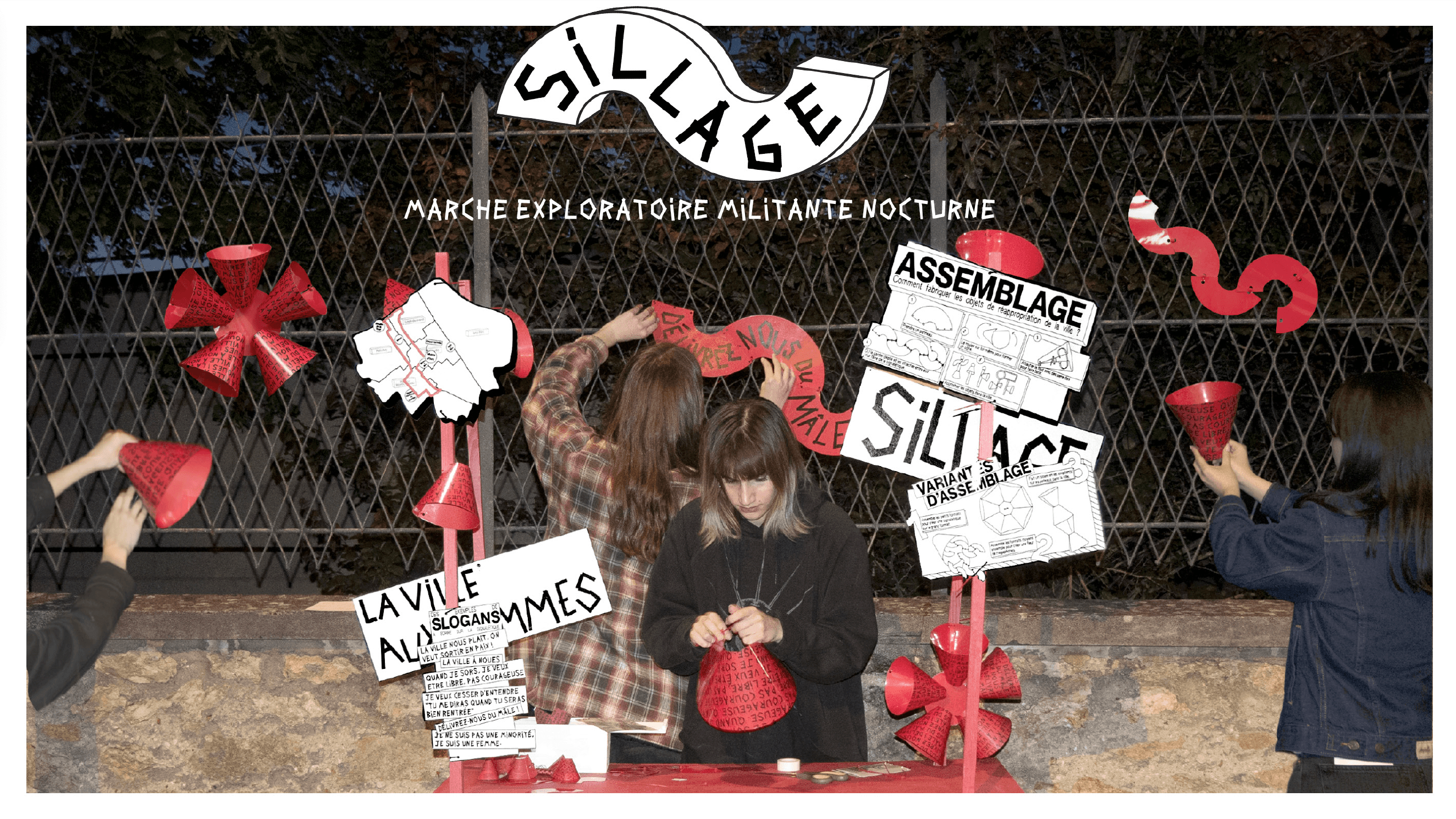 Au fil du parcours, les participantes installent dans la ville des objets modulables de réappropriation : cônes pliés, signalétiques détournées, slogans inscrits au scotch. Ces objets, laissés en place après la marche, fonctionnent comme des traces visibles du passage, des signaux de sororité adressés aux autres habitantes. Ils marquent les lieux perçus comme anxiogènes et transforment temporairement le paysage urbain.